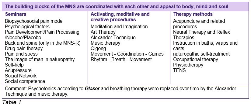 Patients with chronic pain with PNP are treated on an interdisciplinary basis, on an outpatient or day-care basis in the “Munich Naturopathic Pain Intensive Program” (MNS). The MNS is a multimodal day-care 4-week pain program in groups of a maximum of 8 patients, which has been established since 2001 and meets the quality criteria of “Interdisciplinary Multimodal Pain Therapy” (IMST, e.g. according to OPS procedure 8-91.x).
