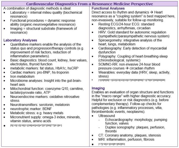 How can heart health be studied from a resonance medicine perspective? Medical research in recent decades has provided us with many diagnostic possibilities. A selection of central and well-validated diagnostic methods is shown in the box below. The list does not claim to be complete, it is rather intended to provide an orientation as to which methods can make a contribution at which level.